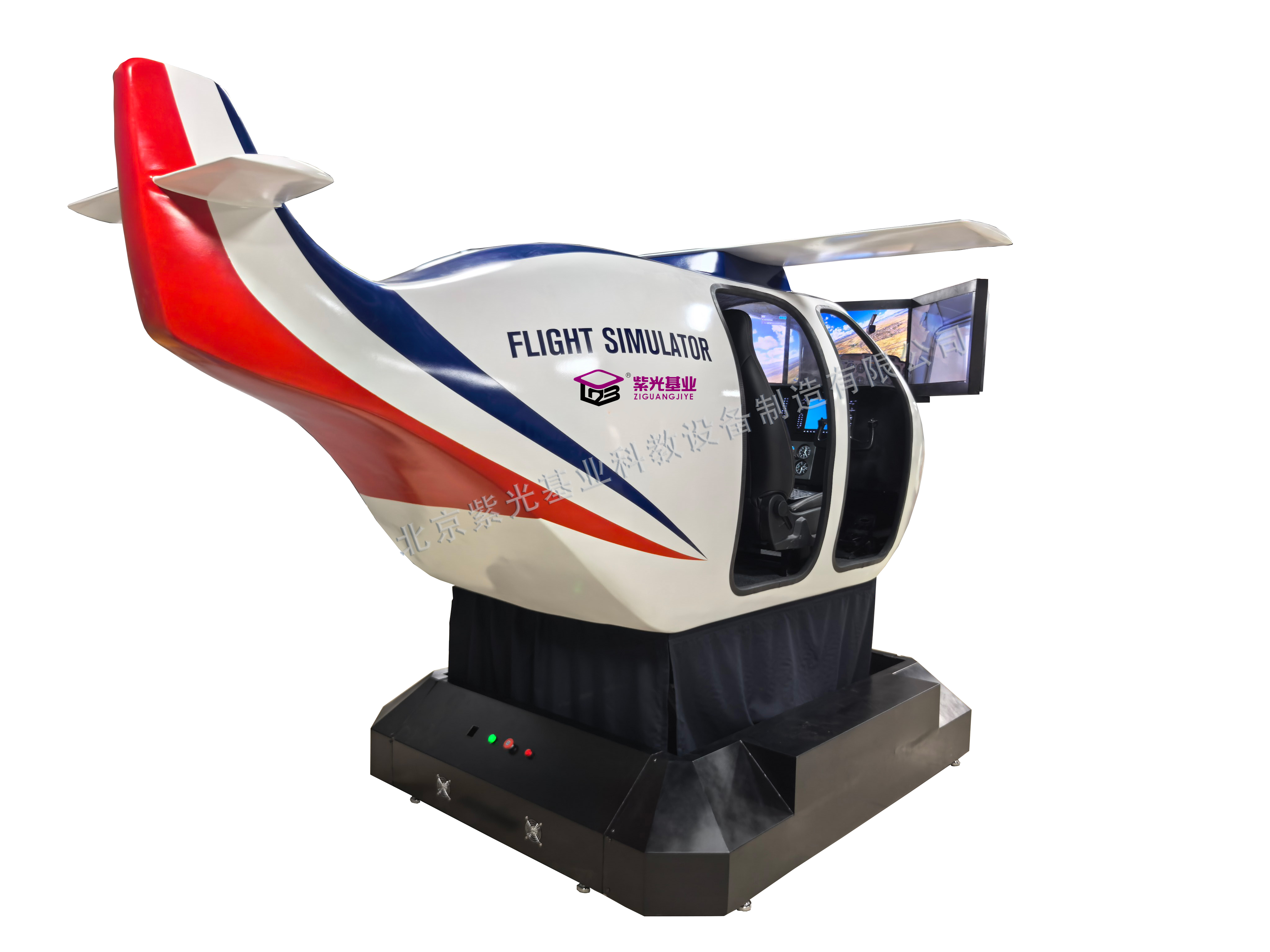北京紫光基业F35战斗机飞行模拟舱采用半包围舱体、仿真飞行座椅、高仿真操纵系统、液晶显示仪表、支持16路控制通道控制。